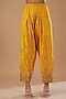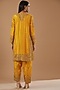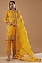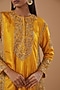 Featuring a yellow short A-line kurta in pure silk base with dabka and zardosi embroidery. It is paired with matching dogri salwar pants and a silk organza dupatta.