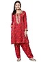 Featuring a red kurta in spandex and cotton base with cheent handblock print and embroidery. It is paired with matching modal satin salwar pants and a silk dupatta.