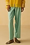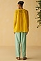 Featuring a yellow top in silk chanderi base with mirror and thread embroidery. It is paired with cotton silk light blue pants and a slip. Accentuate it with statement earrings and block heels for an evening look.