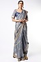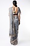Featuring a grey saree in organza base with badla, Hyderabadi micro-pearls, gota, and kasab embroidery. It is paired with a contrasting navy blue blouse.