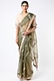 Featuring a sage green saree in organza base with badla, kasab and hyderabadi micro pearl embroidery. It is paired with a contrasting peach blouse having rose gold detailing.
