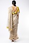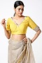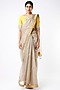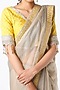 Featuring a mouse beige saree in organza base with badla, kasab and hyderabadi micro pearl embroidery. It is paired with a contrasting yellow silk chanderi blouse having rose gold detailing.
