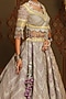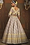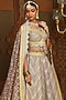 Featuring a purple and lemon yellow kalidar lehenga in silk chanderi base with gota, dori and badla work in chevron pattern. It is paired with a blouse having scalloped paan neckline and a net dupatta. Accentuate this designer lehenga set with statement jewellery and heels for a bridal look.