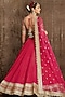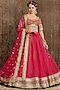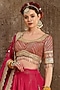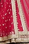 Featuring a rani pink lehenga in cotton shimmer chanderi base with hyderabadi micro pearls, badla and kasab machine embroidery. It is paired with a matching embroidered blouse in silk chanderi base and a net dupatta.