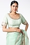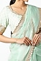 Featuring a sea green saree in organza base with badla, Hyderabadi micro-pearls, gota, and kasab embroidery. It is paired with a matching blouse.