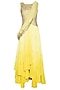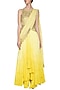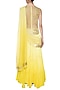 Featuring a yellow crushed ombre drape anarkali in net and viscose chiffon base. It is paired with matching pants.