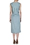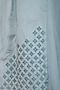Featuring a powder blue wrap dress in chanderi and organza base with geometric reverse applique, tonal kantha and gold embroidery. It has embroidered buttons.