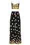 This set features a gold bustier with skein work all over the front and back. It is paired with black palazzo pants in italian jersey base with bloom skien work all over and comes along black silk crepe cape with kite skein work on the edges.
