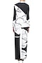 This set features a black and white optic print peplum jacket in neoprene polyblend base. It has a plunging neckline and is paired with matching optic print wide leg pants.