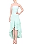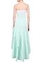 Featuring a mint green strapless cascade gown in neoprene polyblend base. It has a ruffled asymmetric hemline and concealed zipper closure on the side.