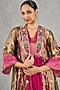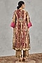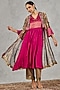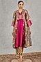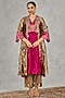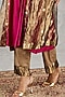 Featuring a golden jacket in tissue silk base with embroidery. It is paired with cotton pants and a cotton silk slip. Accentuate it with polki earrings and block heels for festive gatherings or pooja ceremony.
