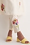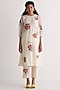 Featuring an ivory gathered dress in chanderi base with sheer texture and flower bunch applique work. It is paired with matching cotton pants.