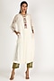 Featuring an ivory kurta in chanderi base with mirror and zardosi embroidery. It is paired with contrasting pants in cotton and golden striped chanderi base and slip.
