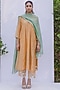 Featuring a mustard yellow straight kurta in handwoven chanderi base with pintuck detailing. It is paired with matching rose jaal hand block printed cotton pants and a contrasting sage green chanderi lace dupatta.