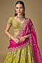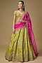 Featuring a bright green lehenga in dupion base with zardosi embroidery. It is paired with an embroidered blouse and a pink embroidered dupatta. Accentuate the designer lehenga with kundan polki or meenakari jewellery, a sleek bun, embellished heels and a potli bag for a bridal look, Perfect wear for your wedding, mehendi or engagement ceremony.