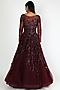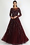 Featuring a burgundy gown in net base with embroidery and full sleeves.