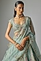 Featuring a green lehenga in dupion silk base with zardosi, resham and sequins embroidery. It is paired with an embroidered blouse and a dupatta. Accentuate the designer lehenga with swarovski or zircon jewellery, embellished heels and a potli bag for a bridal look, Perfect wear for your wedding or engagement ceremony.