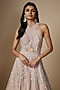 Featuring a pink gown in net base with criss-cross halter neck, cutdana and crystal embroidery. Accentuate it with dangler earrings and heels for an engagement or sangeet ceremony.