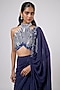 Featuring a teal blue ombre draped saree in georgette base. It is paired with a halter-neck blouse having sequins embroidery. Accentuate the designer saree with kundan polki or meenakari jewellery, embellished heels and a potli bag for an elegant look, Perfect wear for your wedding, sangeet or engagement ceremony.