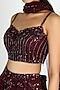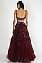Featuring a wine lehenga in net base with jaal work. It is paired with a matching strappy blouse and a dupatta.