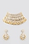 Featuring a 18kt gold plated necklace studded with imitation kundan, semi-precious stones and natural gem stones, set in copper. It is paired with a matching pair of earrings.