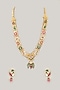 Featuring a 18kt gold plated long necklace studded with jadau kundan polki, natural gemstones and semi-precious stones, set in copper. It is paired with a matching pair of earrings. Perfect choice for parties, and other Indian festivities.