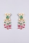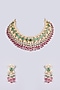Featuring a 18kt gold plated jadau necklace studded with kundan polki, semi-precious stone and gemstones, set in copper. It is paired with a matching pair of earrings. Perfect for any evening soirees, weddings or festive occasions.