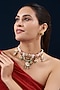 Featuring a 18kt gold plated choker necklace studded with jadau, kundan polki, semi-precious and natural stones, set in copper. It is paired with a matching pair of earrings.