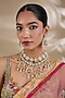 Featuring a 18kt gold plated jadau long necklace studded with kundan polki, semi-precious stone and gemstones, set in copper. It is paired with a matching pair of earrings. Perfect for any evening soirees, weddings or festive occasions.