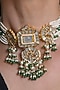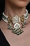 Featuring a 18kt gold plated choker necklace studded with mother of pearls, set in copper. It is paired with a matching pair of earrings. This jewellery elevates weddings, parties and festive looks, style it with embellished outfits and heels for a refined, glamorous finish.