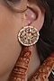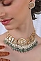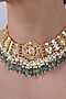 Featuring a 18kt gold plated choker necklace studded with mother of pearls, set in copper. It is paired with a matching pair of earrings. This jewellery elevates weddings, parties and festive looks, style it with embellished outfits and heels for a refined, glamorous finish.