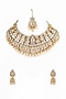 Featuring a 18kt gold plated necklace studded with kundan polki, semi-precious stones and natural gemstones, set in copper. It is paired with a matching pair of earrings and a maangtikka.