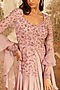 Featuring a lilac lehenga in georgette, crepe, and net base. It is paired with a matching top having hand embroidery and attached georgette side layers and a ruffled dupatta.
