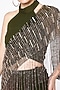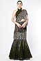 Featuring an olive fish-tail skirt in viscose georgette and net base with gold and champagne tassels hand embroidery. It is paired with a matching blouse having an attached drape.