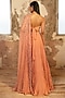 Featuring a peach ruffled lehenga in georgette, net, and crepe base with embellishments. It is paired with a matching blouse having floral hand embroidery and a dupatta.