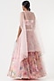 Featuring a blush pink lehenga in tulle base with digital print and aari embroidery. It is paired with a matching satin printed blouse having hand embroidery, a belt and a net embroidered cape.