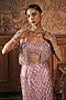Featuring a dusty rose pink jacket in net base with hand embroidery. It is paired with a bustier and a skirt. Accentuate it with zircon jewellery and block heels for festive or cocktail ceremony.