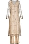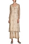 Featuring an ivory tunic in silk organza base with block print, hand embroidered motif and sage green maxi inside. It is paired with a matching palazzo pants in silk chanderi base having japanese pipe highlights.