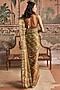 Featuring an olive green pre-stitched saree in glass organza and dupion silk base with floral print. It is paired with a hand embroidered corset, belt and petticoat. Accentuate it with statement jewellery and heels for festive occasions or wedding ceremonies.