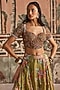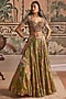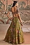 Featuring an olive green lehenga in glass organza base with print and hand embroidery. It is paired with a net corset and a dupatta. Accentuate it with statement jewellery and heels for festive occasions or wedding ceremonies.