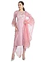 Featuring a rose pink tunic in metallic georgette base with organza bell sleeves and tiny floral hand embroidery. It is paired with matching dhoti pants and organza dupatta.