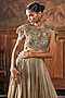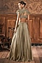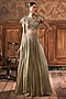 Featuring a sage green cape in net and satin base with floral motif and applique hand embroidery. It is paired with a blouse and a skirt. Accentuate it with polki jewellery and block heels for festive or mehendi ceremony.