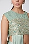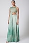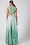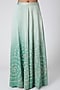 Featuring a turquoise crop top in silk chanderi and chiffon base with resham embroidery. It is paired with matching linen satin pants.