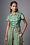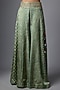 Featuring a green short shirt in vegan gajji silk base with ajrakh print and embroidery. It is paired with palazzo pants. Accentuate it with dangler earrings and heels for a festive occasion, carnival or trousseau.