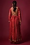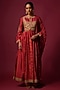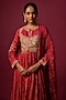Featuring a red anarkali in slub silk base with print. It is paired with an embroidered jacket, pants and a dupatta. Accentuate it with statement earrings and heels for a festive occasion or sangeet ceremony.