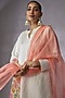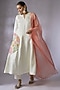 Featuring an ivory A-line kurta in silk linen satin base with applique, pearl, sequins and pastel beads embroidery. It is paired with straight pants and a peach organza silk dupatta having crystal and pearl tassel detailing. Accentuate this set with block heels and jhumkas for a festive-ready look.