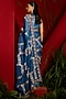 Featuring a teal blue saree in silk organza base with hand screen print and embroidery. It is paired with a matching halter neck blouse and a petticoat. Accentuate it with statement earrings and heels for a sangeet or an engagement ceremony.
