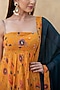 Featuring an old gold anarkali in georgette, silk, and shantoon base with embroidery. It is paired with a contrasting blue pansy skirt and a dupatta.