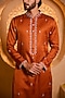 Featuring a burnt orange kurta in swiss silk base with mirror work and hand embroidery. It is paired with pants. Style with kolhapuri sandals for a festive, cultural occasion, haldi, wedding or engagement ceremony, exuding traditional charm and elegance.