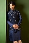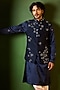 Featuring a midnight blue waistcoat in dupion silk base with beadwork and hand embroidery. It is paired with a kurta and pants. Style with mojaris for a festive occasion, wedding, sangeet or engagement ceremony, exuding traditional charm and elegance.
